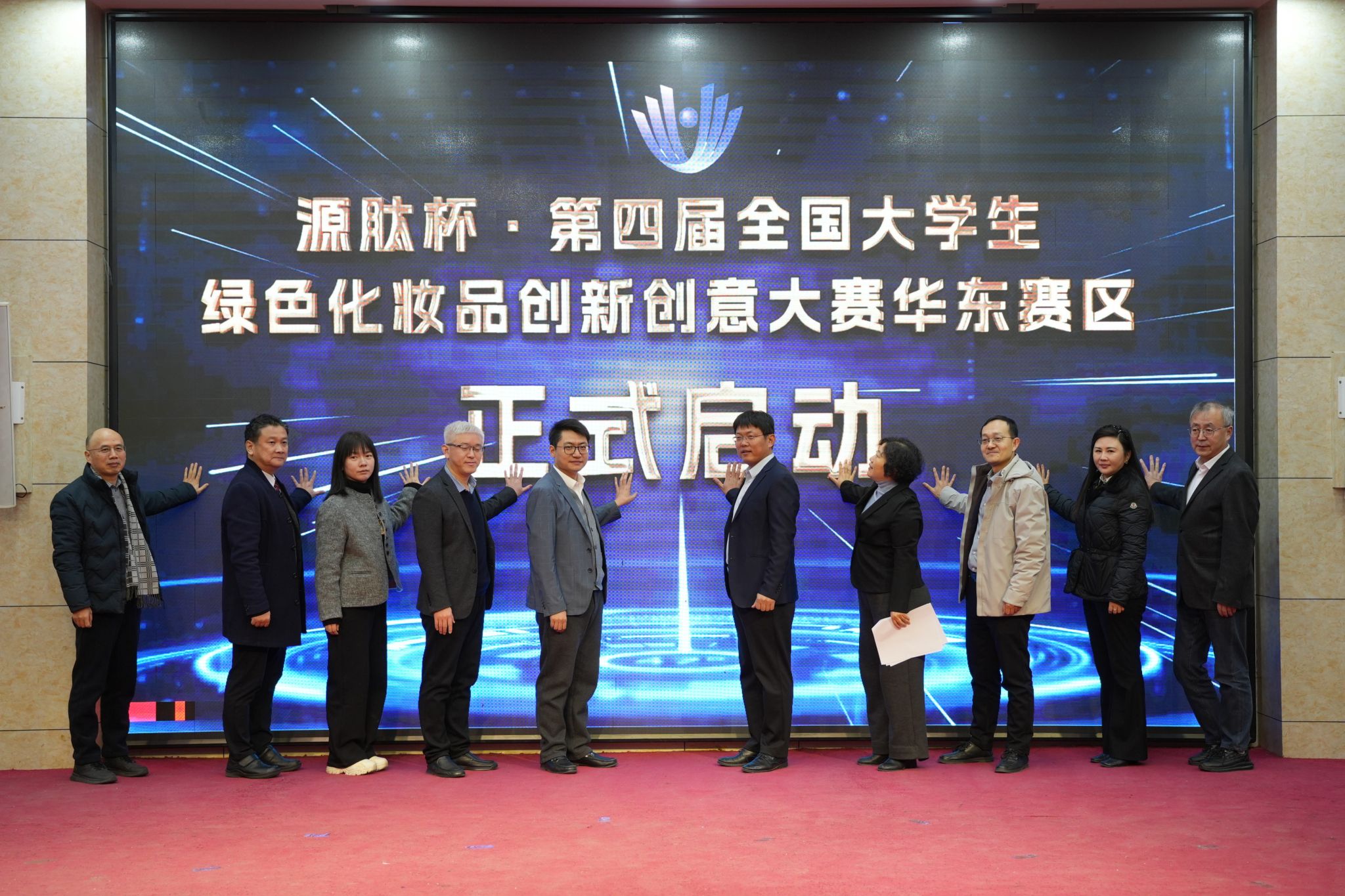 在全场嘉宾和师生们的共同见证下,程伟、曹晓荣,以及齐鲁工业大学化妆品学科带头人王领,徐州工程学院材料与化学工程学院院长庄文昌,山东大学教授李洪光,江南大学副教授陈香,苏州大学-白云美湾国际化妆品协同创新中心执行院长、苏州大学产业教授、高级工程师董伊航,酶好生活集团悦更创始人易琳,厦门医学院教授王贵弘,上海应用技术大学教授宋思根共同上台触屏点亮启动装置,标志着源肽杯・第四届全国大学生绿色化妆品创新创意大赛华东赛区正式启动。