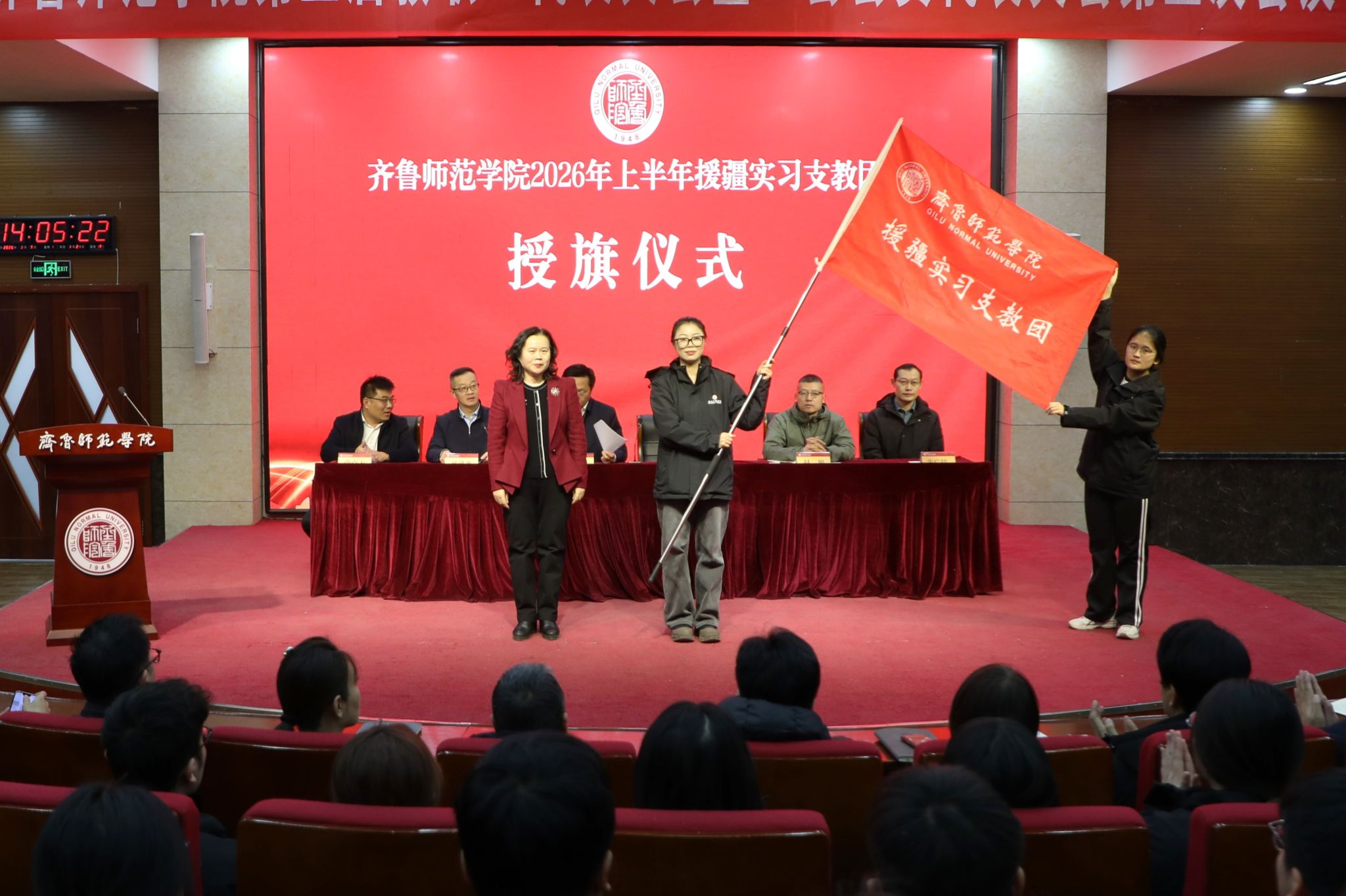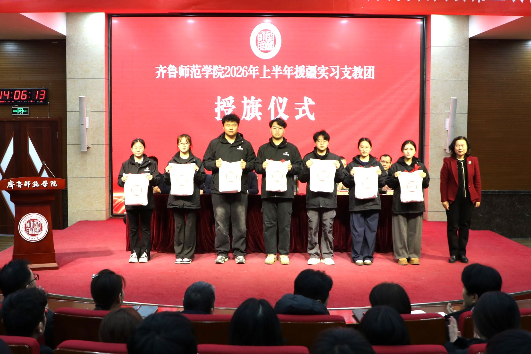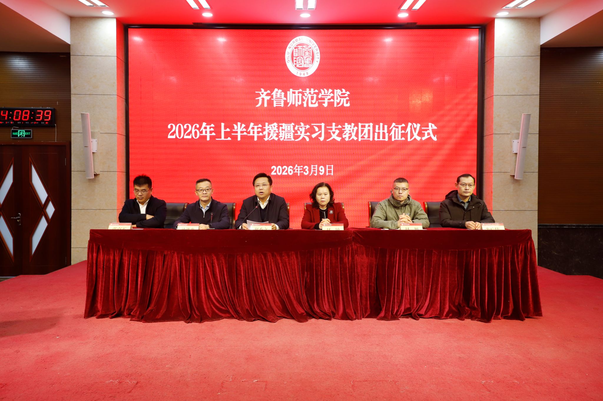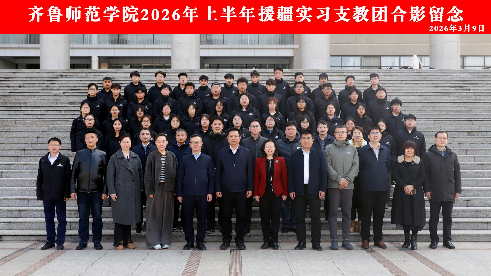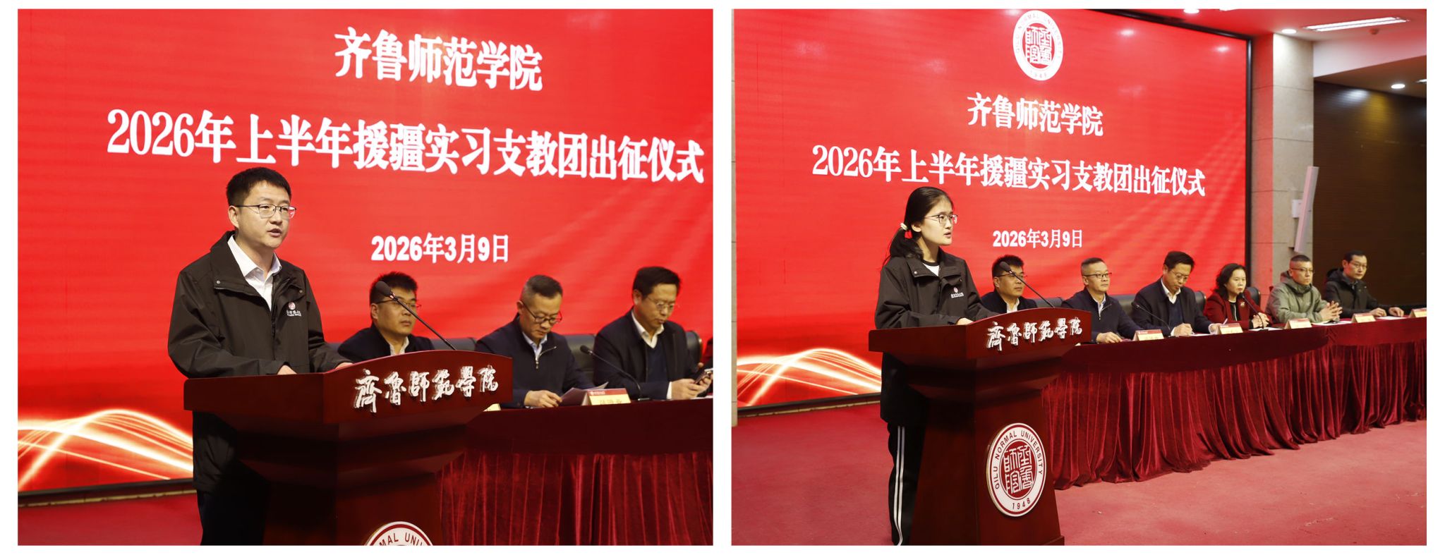 3月9日下午,齐鲁师范学院2026年上半年暨第九批援疆实习支教团出征仪式在章丘校区第一学术报告厅举行。党委副书记、校长郑秀文,党委副书记赵敏出席仪式。仪式由党委委员、副校长孙洪兆主持。学生工作处、团委、教务处负责人,文学院、历史文化学院、数学学院、物理与电子工程学院、地理与旅游学院、音乐学院、体育学院、美术学院党政负责人,第九批援疆实习支教团全体师生参加。