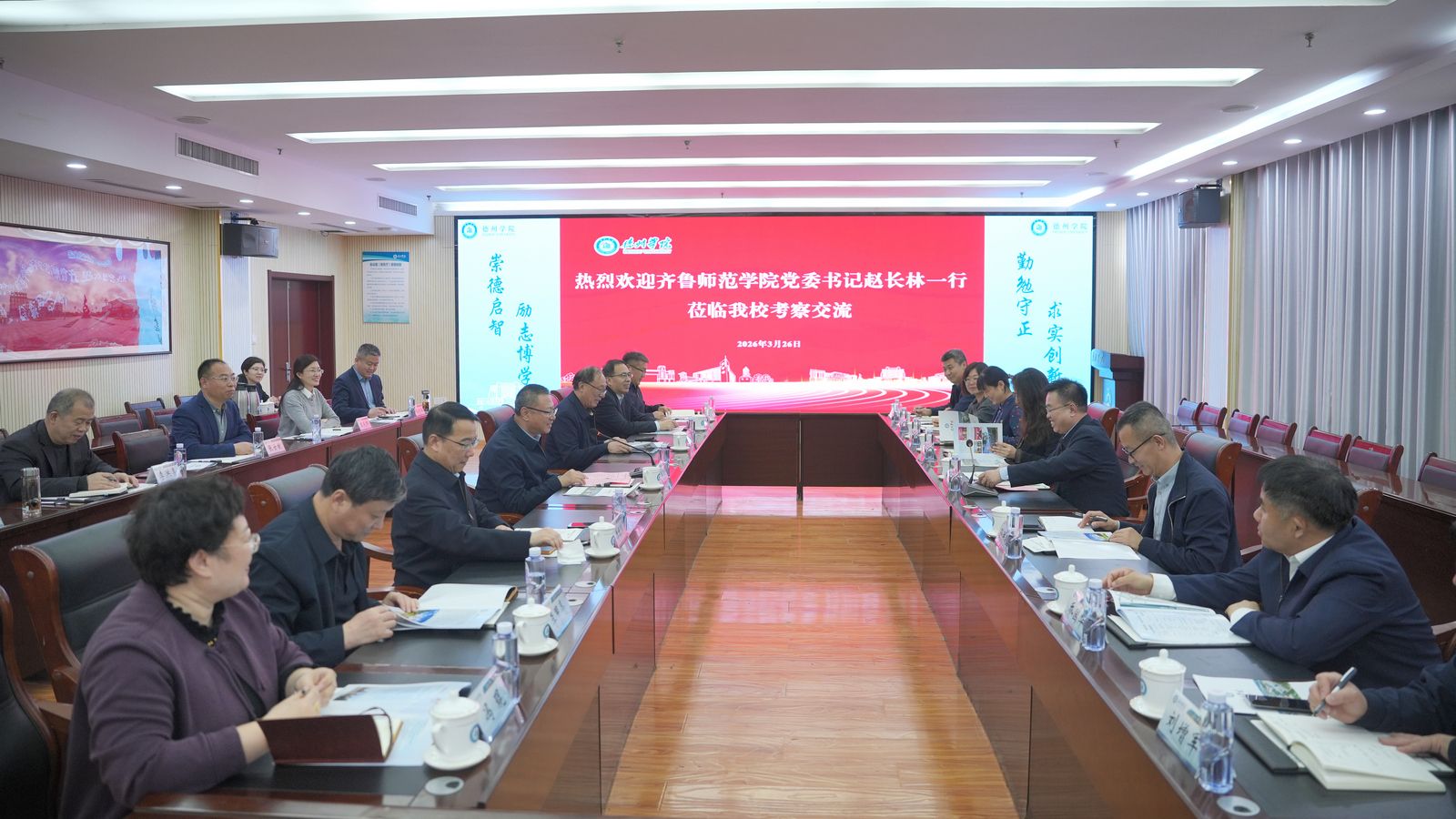3月26日,学校党委书记赵长林,党委委员、副校长孙洪兆,党委委员、组织部部长宗美娟等赴德州学院考察交流。德州学院党委书记吴君,党委副书记张存峰,党委委员、副校长单振涛,党委委员、副校长刘印房,党委委员、副校长李甲亮,党委委员、宣传部(教师工作部)部长冯琨等接待来访并出席座谈会。