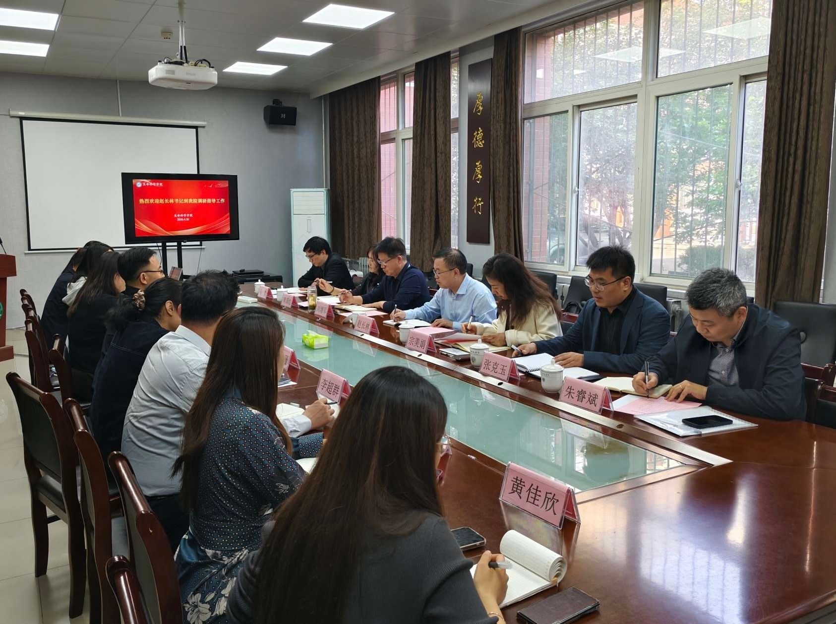 赵长林认真听取了生命科学学院党委书记张海龙关于党建工作、学科建设、专业建设、学生工作与人才培养等方面的汇报,并与学院教师亲切交流,深入了解学院各项工作的主要特色与突出成果。各职能部门负责人结合职责分工,就学院发展相关事项提出了建设性指导意见。