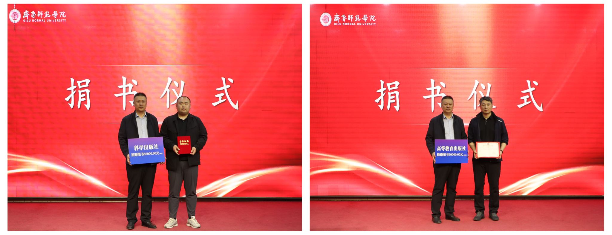 科学出版社、高等教育出版社现场向学校捐赠图书,学校图书馆馆长王允华代表学校接受捐赠。