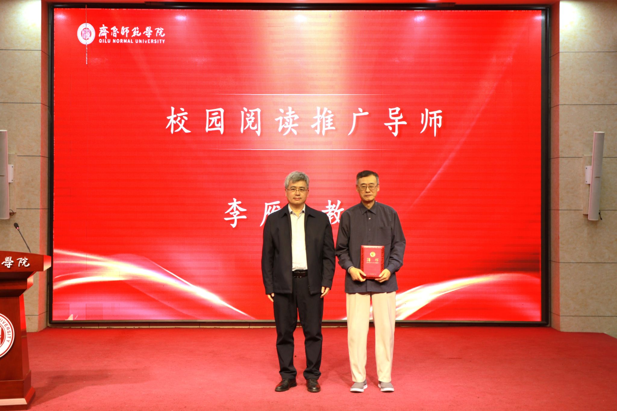 张兆明为“校园阅读推广导师”文学与历史文化学院李雁教授颁发聘书。