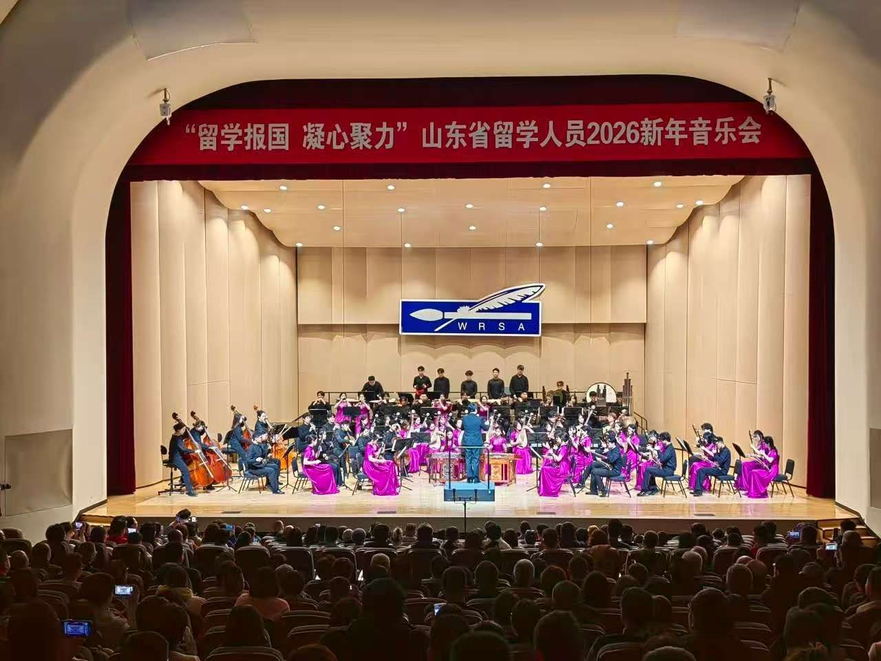 12月27日晚,由山东省欧美同学会主办的“留学报国 凝心聚力”全省留学人员2026新年音乐会在济南剧院举行。省直统战系统机关干部,省欧美同学会各专委会成员,各市、有关国有企业、高等院校、科研院所欧美同学会领导班子成员和部分会员代表,以及全省统一战线各领域代表人士等800余人共同观看演出。我校党委委员、统战部部长宋新刚,欧美同学会秘书长田甜及20余名教师代表参加新年音乐会。