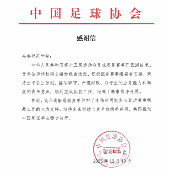 喜报!中国足球协会向齐鲁师范学院发来感谢信