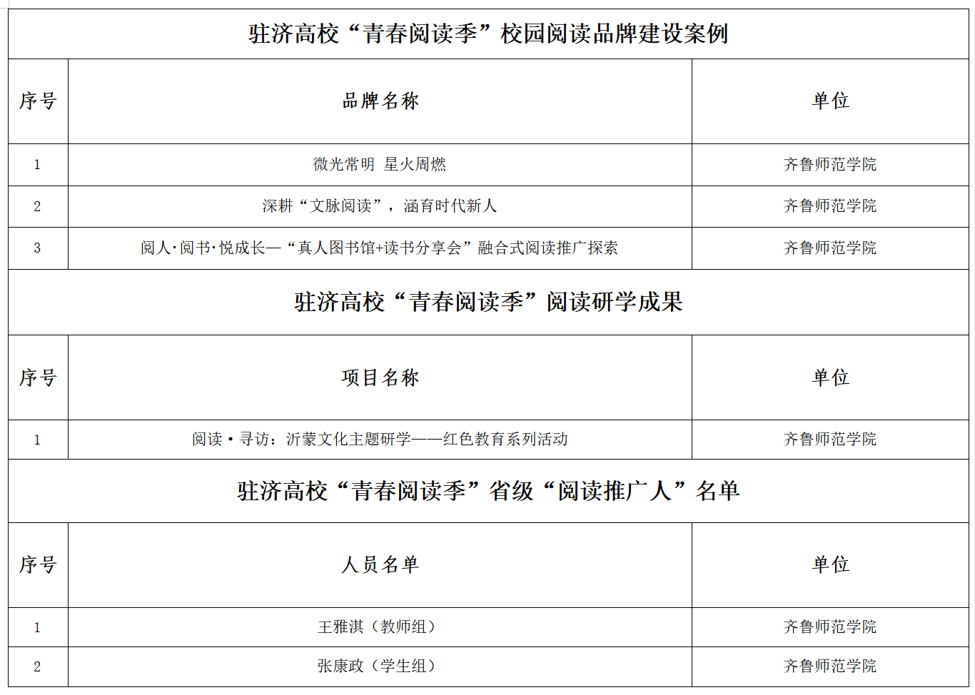经组委会评选,学校图书馆报送的《微光常明 星火周燃》《深耕“文脉阅读”,涵育时代新人》《阅人・阅书・悦成长—“真人图书馆+读书分享会”融合式阅读推广探索》三个项目,荣获“驻济高校‘青春阅读季’校园阅读品牌建设案例”;信息科学与工程学院报送的《阅读·寻访:沂蒙文化主题研学——红色教育系列活动》荣获“驻济高校‘青春阅读季’阅读研学成果”。学校教师王雅淇获评驻济高校“青春阅读季”省级“阅读推广人”(教师组),经济与管理学院2024级经济与金融2班学生张康政获评驻济高校“青春阅读季”省级“阅读推广人”(学生组)。
