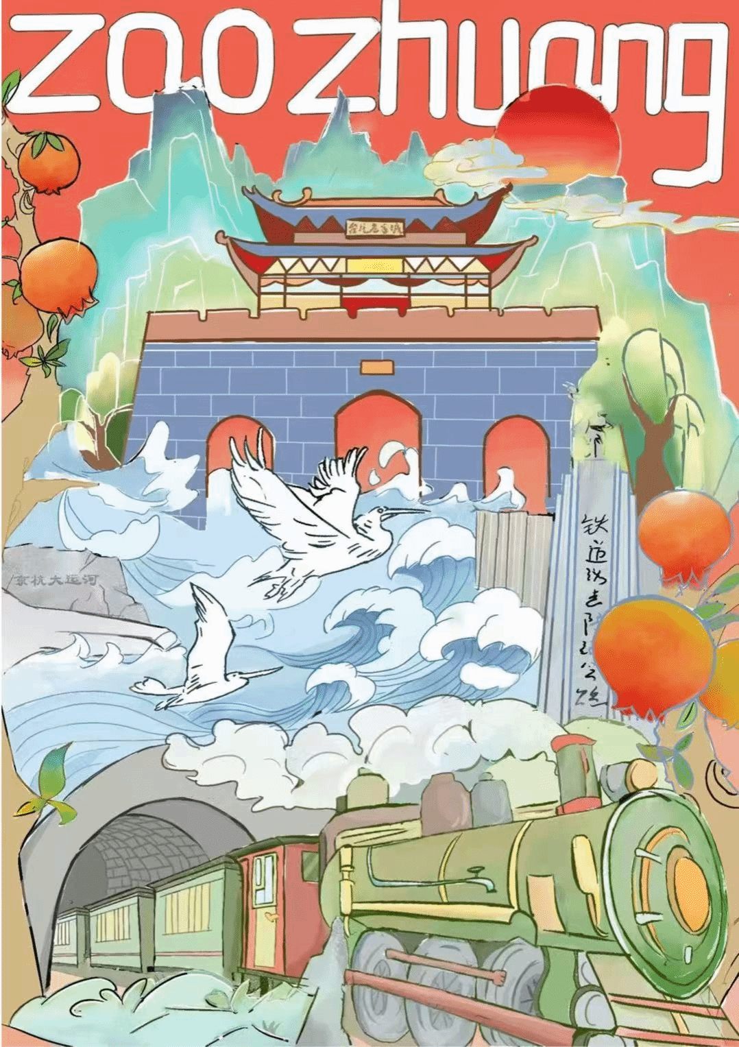 2024级包装设计一班董响晨以“ZOO ZHUANG”为创意表达,将台儿庄古城作为视觉核心,融合京杭大运河的浪涛、飞驰的绿皮火车与象征丰收的石榴元素,辅以青绿山水与红日意象,既展现“天下第一庄”的历史底蕴,又凸显运河文化与铁道精神的时代张力。