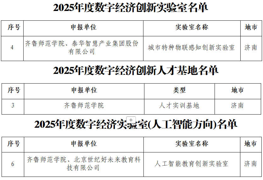 近日,山东省工业和信息化厅公布了2025年度山东省数字经济创新平台名单,我校申报的城市特种物联感知创新实验室、人才实训基地和人工智能教育创新实验室三个平台成功入选。这标志我校在服务山东数字经济高质量发展、推动相关领域科技创新与人才培养方面取得了重要突破。