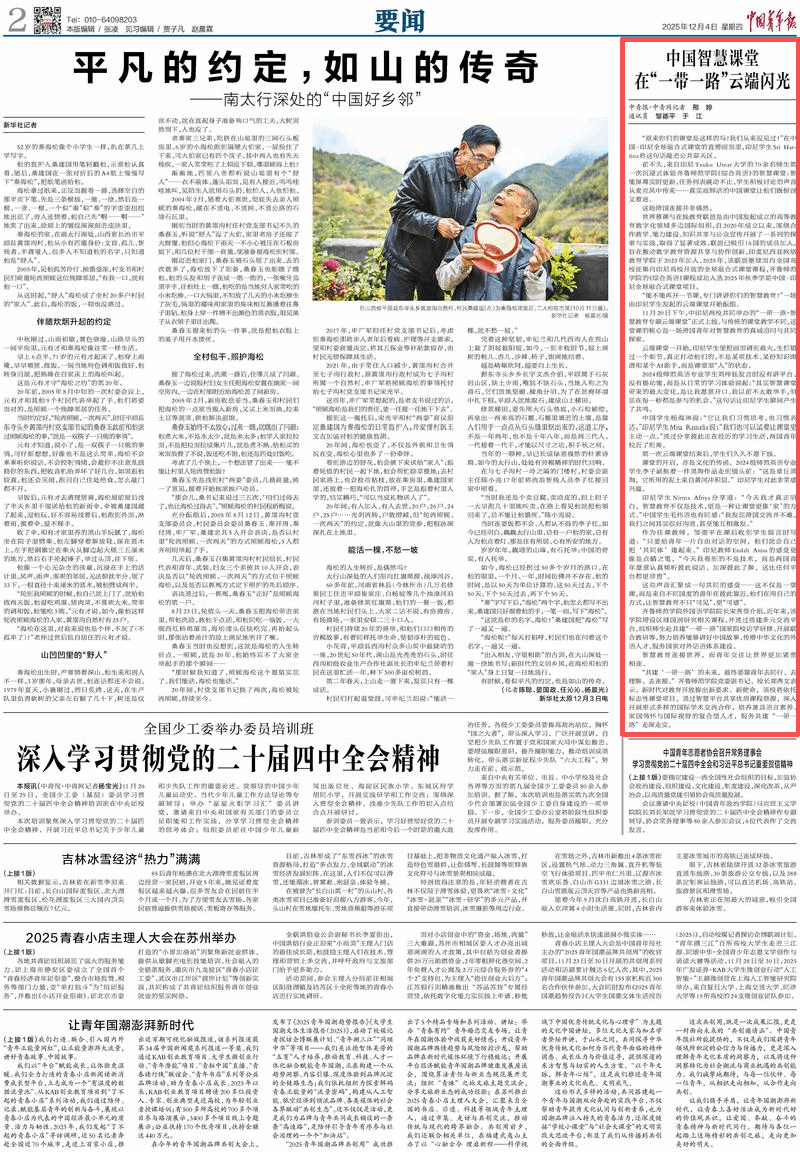 2025年12月4日,《中国青年报》在“要闻”(第02版)版块以《中国智慧课堂在“一带一路”云端闪光》为题,对我校外国语学院《综合英语》课程参与中国—印尼全球融合式课堂项目并成功开展“一带一路·智慧教育专题云端课堂”活动进行了详细报道。