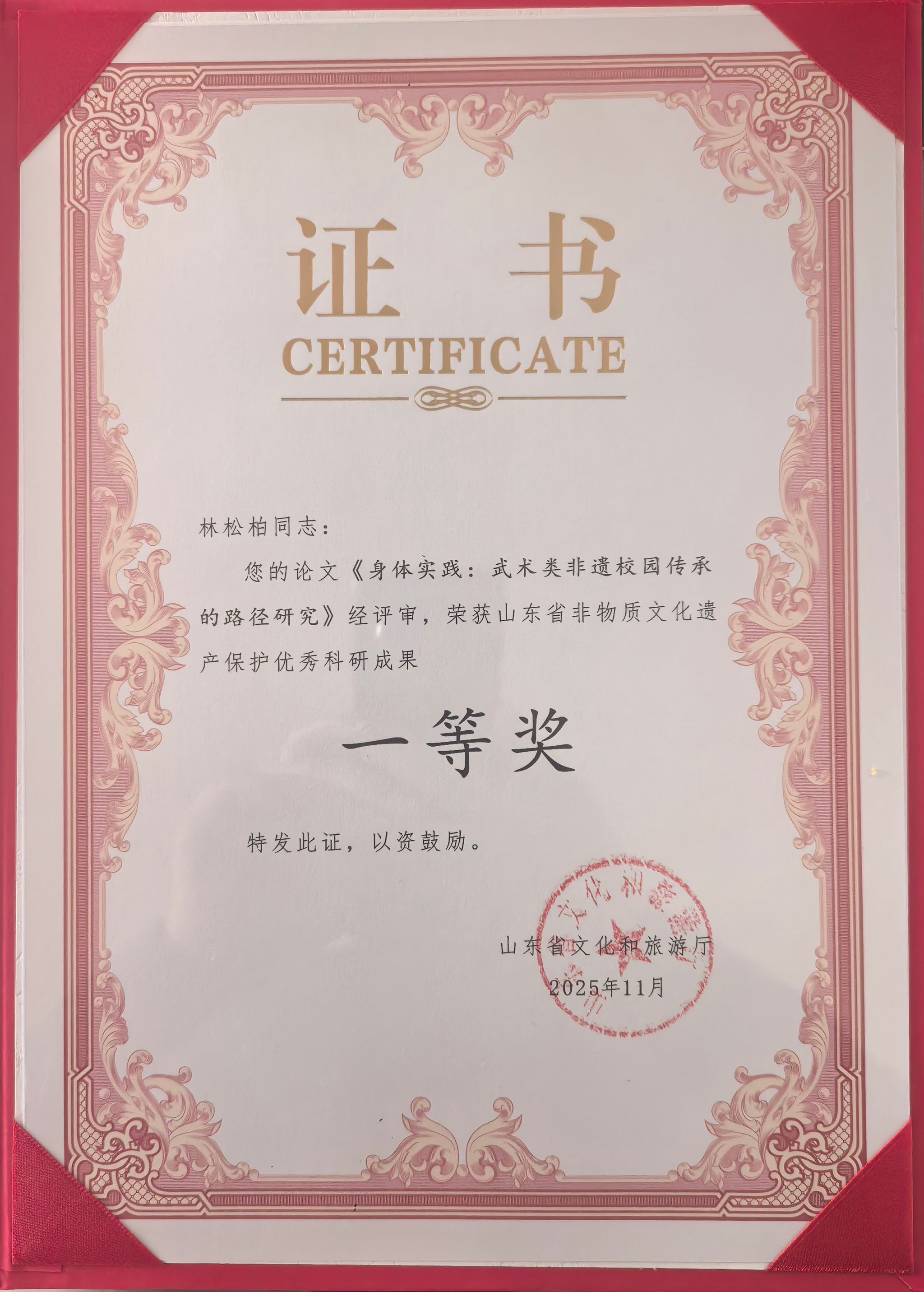 近日,山东省文化和旅游厅公布了山东省非物质文化遗产优秀科研成果获奖名单,我校林松柏教授的论文《身体实践:武术类非遗校园传承的路径研究》荣获一等奖。