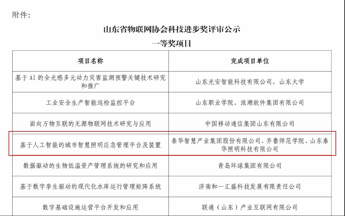 山东省物联网协会科技进步奖是依据《国家科学技术奖励条例》设立的社会力量科技奖项,获奖项目代表着山东省物联网领域技术研发与产业应用的先进水平,具有较高的行业权威性和认可度。本次评选中,物理与电子工程学院与泰华智慧产业集团股份有限公司、山东泰华照明科技有限公司联合完成的《基于人工智能的城市智慧照明应急管理平台及装置》项目荣获一等奖,学院独立完成的《“感知-定位-降噪”多维协同一体化关键技术》项目荣获三等奖,两项成果均凭借技术创新性、应用实用性得到评审专家的高度评价。