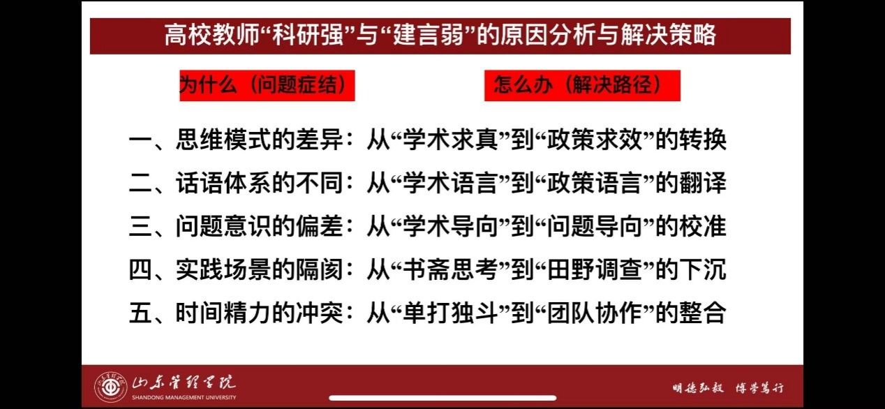辛宝英教授系统分析了议政报告与一般学术论文的差异,结合两会期间政府工作报告的现实问题,从思维模式的差异、话语体系的不同、问题意识的偏差、实践场景的隔阂、时间精力的冲突五个方面指出了当前智库研究工作中存在的突出问题和议政报告撰写的问题症结。随后,他围绕从“学术求真”到“政策求效”的转换,从“学术语言”到“政策语言”的翻译,从“学术导向”到“问题导向”的校准,从“书斋思考”到“田野调查”的下沉,从“单打独斗”到“团队协作”的整合五个层面,就撰写高质量议政报告提出了独到见解和破解路径。最后,辛宝英选取了近两年自己具有代表性的智库成果范例进行现场讲解,通过具体案例,使与会教师对高质量智库报告的选题、结构、论证及行文规范有了更为直观和深刻的理解。