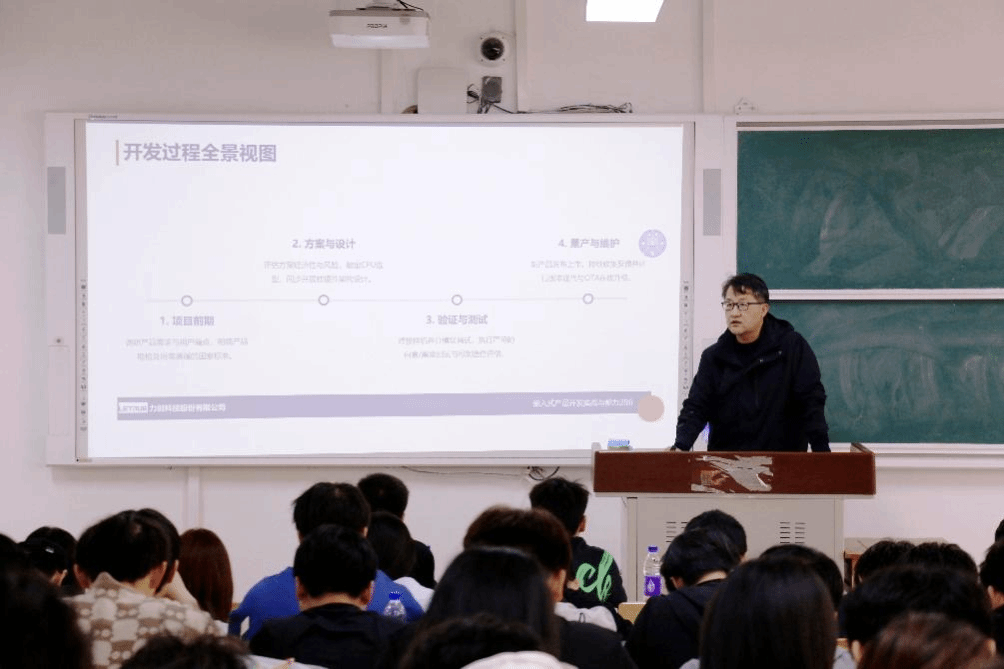 报告以“嵌入式产品开发实战与能力进阶”为主题,报告伊始,全体师生共同观看企业宣传片,直观了解力创科技在计量检测、芯片研发等领域的发展历程与深厚技术积淀。随后,赵增强以此为切入点,从嵌入式产品开发概况、典型产品应用案例、专业能力进阶路径三个方面展开细致分享,系统阐释嵌入式产品从方案设计、研发测试到落地量产的完整开发流程与行业标准。同时,他结合自身多年一线工作经验,梳理专业核心知识学习要点,介绍相关领域多元职业发展方向,鼓励同学们夯实专业基础,坚持勤学善思、勇于创新。