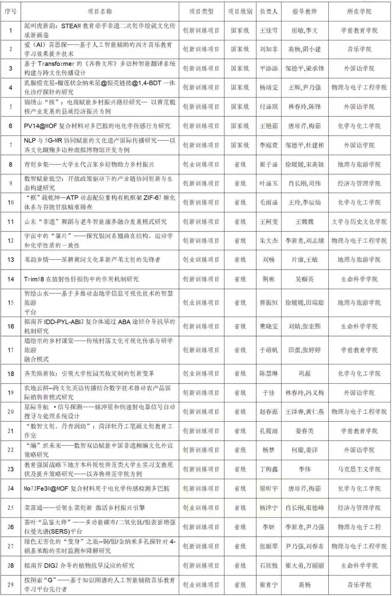 近日,山东省教育厅公布2025年国家级、省级大学生创新训练计划项目立项名单,我校29个项目获批立项,其中国家级大学创新计划项目7项,省级大学生创新创业训练计划项目22项。