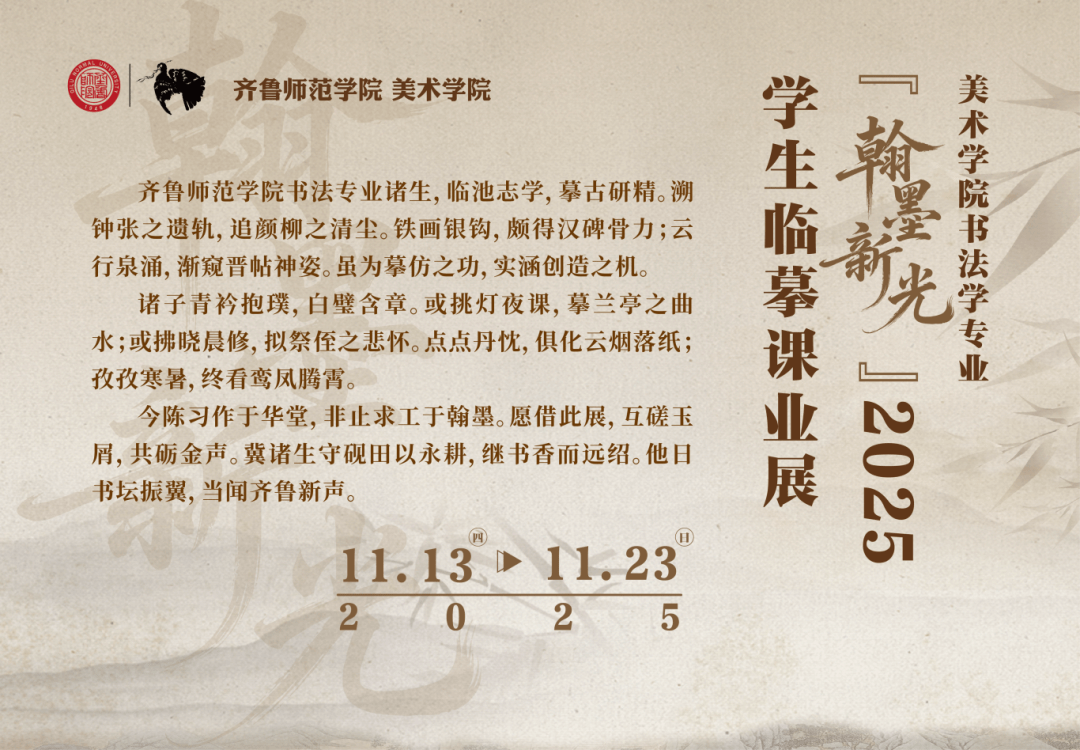 11月13日下午,齐鲁师范学院美术学院书法学专业“翰墨新光”2025年学生临摹课业展开幕式在历下校区美术馆圆满举行。美术学院院长杨三军、美术学院副院长王华军以及美术学院教师团队出席开幕式,开幕式由美术学院书法教研室主任朱茂刚主持。