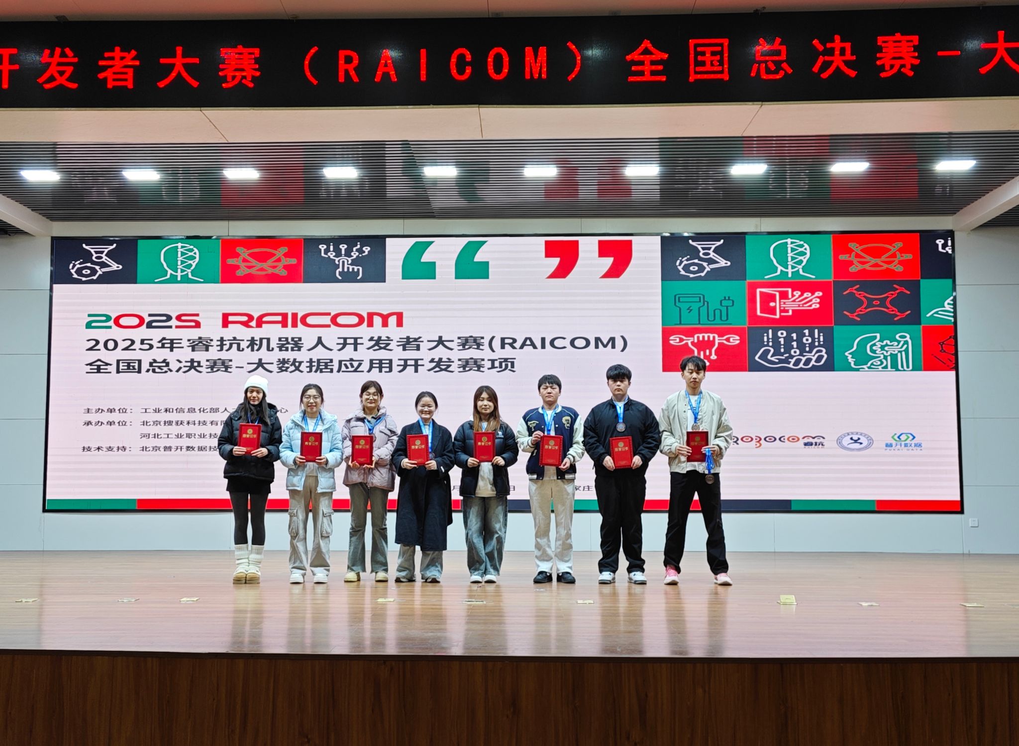 近日,2025年睿抗机器人开发者大赛(RAICOM)全国总决赛-大数据应用开发赛项在河北工业职业技术大学落下帷幕。信息科学与工程学院(人工智能学院)选派的9名学子组成参赛代表队,在刘爱芹、吕素媛两位带队教师的指导下斩获国家级一等奖1项、三等奖8项,不仅创下学院参赛以来的最佳战绩,更实现了学校在该赛事国赛一等奖奖项上的历史性突破。