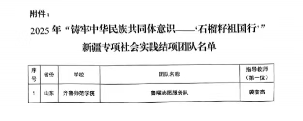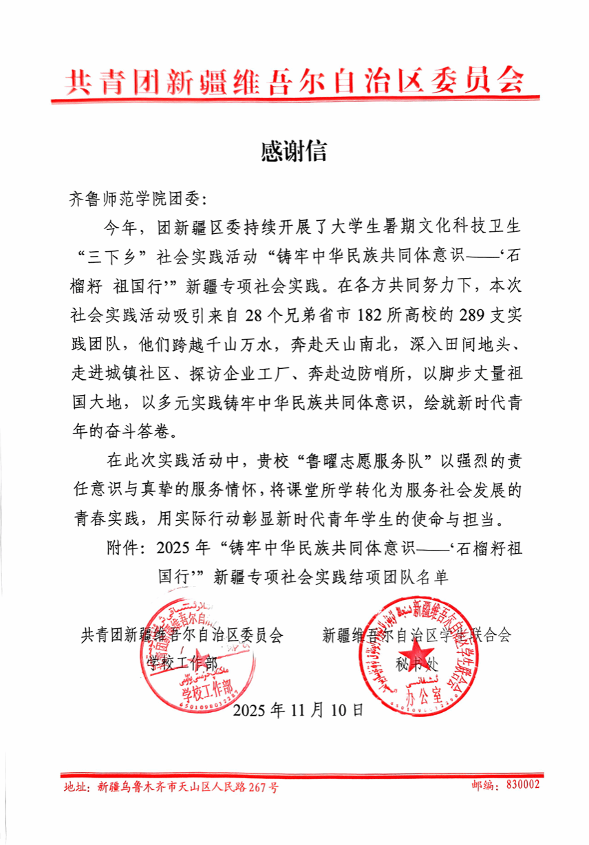 近日,共青团新疆维吾尔自治区委员会、新疆维吾尔自治区学生联合会向我校发来感谢信,对我校“鲁曜志愿服务队”在2025年“铸牢中华民族共同体意识——‘石榴籽祖国行’”新疆专项社会实践活动中的扎实工作和突出贡献给予高度评价与衷心感谢。