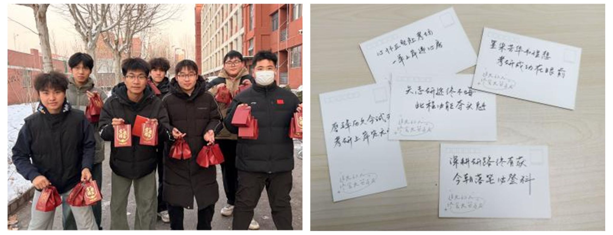 为配合个性化复习推进,学院经过精准调研学生备考实际需求,精心筹备并集中分发考研大礼包,为学生提供实用支持与暖心关怀。礼包内不仅涵盖笔记本、中性笔、涂卡笔、橡皮等日常复习必备物资,更特别定制了印有“研途逐梦,数院同行”字样的专属书签与精细化备考时间规划表,既满足学业复习的物资刚需,又传递学院对学生的殷切期许。分发过程中,学院老师与学生亲切交流,详细了解近期备考进度,叮嘱大家合理运用礼包物资梳理知识体系、积累错题经验。学生们纷纷表示,这份充满温度的大礼包不仅实用性强,更让他们感受到了学院的牵挂与支持,进一步激发了全力以赴冲刺备考的动力。