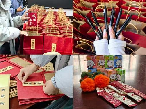活动筹备阶段,外国语学院青年志愿者协会的同学们化身“暖心使者”,分工协作、默契配合。从礼物的精挑细选与搭配,到包装的创意设计与制作,每一个环节都凝聚着志愿者们的心血与诚意,只为将最纯粹的祝福与最贴心的关怀,精准传递给每一位奋力拼搏的考研学子。