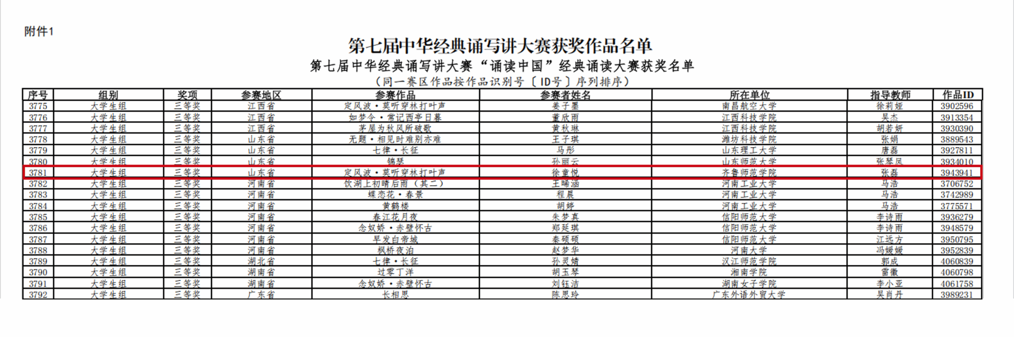 1月4日,第七届中华经典诵写讲大赛总决赛获奖名单正式揭晓。由文学与历史文化学院张磊老师指导的2023级汉语言文学(师范类)专业学生徐童悦讲解的《定风波·莫听穿林打叶声》在“诗教中国”诗词讲解大赛中脱颖而出,荣获大学生组全国三等奖。