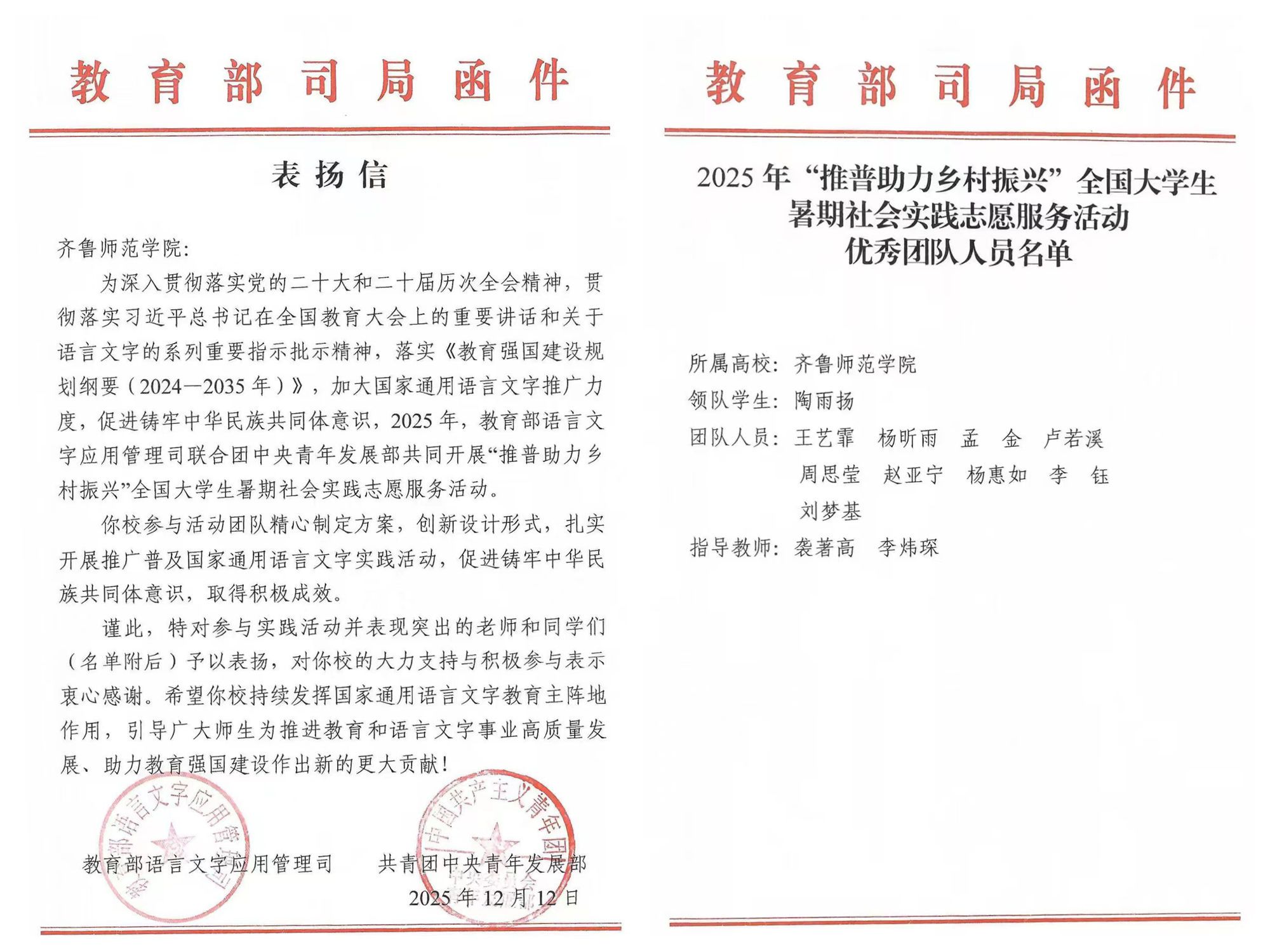 近日,教育部语言文字应用管理司、共青团中央青年发展部联合向齐鲁师范学院发来表扬信,对学校在2025年“推普助力乡村振兴”全国大学生暑期社会实践志愿服务活动中取得的积极成效和鲁曜志愿服务队师生予以表扬。