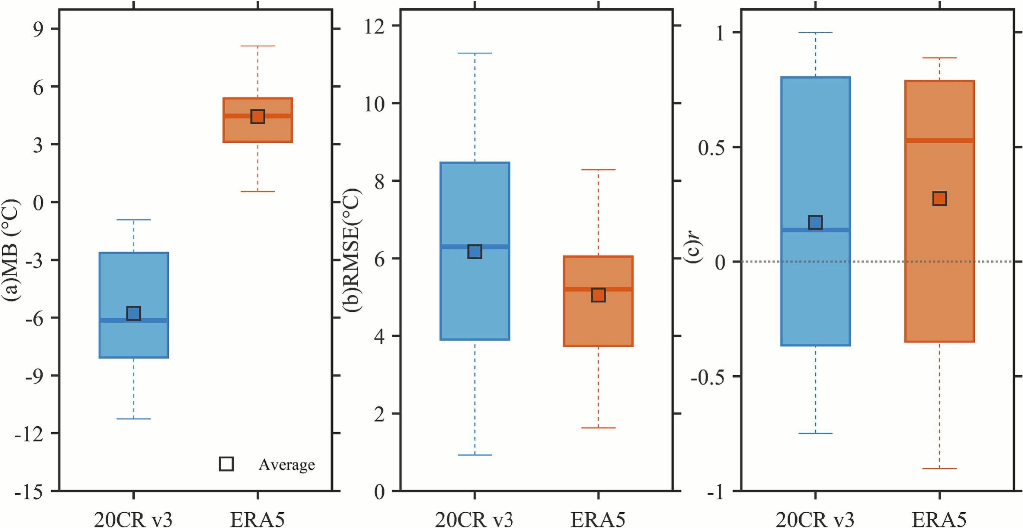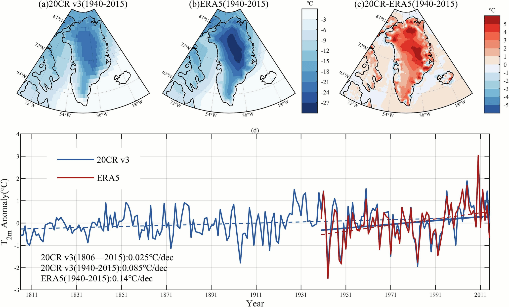 本研究基于1806–2015年间的站点观测与冰芯重建温度,从时空多尺度系统评估了20CR v3和ERA5再分析资料在格陵兰地区对2米气温和降水的再现能力。结果表明,虽然20CR v3的精度整体略低于ERA5,但两者在气候模态上表现一致,使得20CR v3在研究格陵兰百年尺度气候演变中仍是一个不可或缺的数据源。