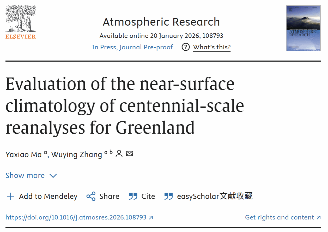 近日,齐鲁师范学院地理与旅游学院2023级本科生马亚潇以第一作者身份,在国际期刊Atmospheric Research(SCI 2区期刊;IF=4.4)发表题为“Evaluation of the Near-surface Climatology of Centennial-scale Reanalyses for Greenland”的研究论文。该论文由张悟颖副教授指导完成。