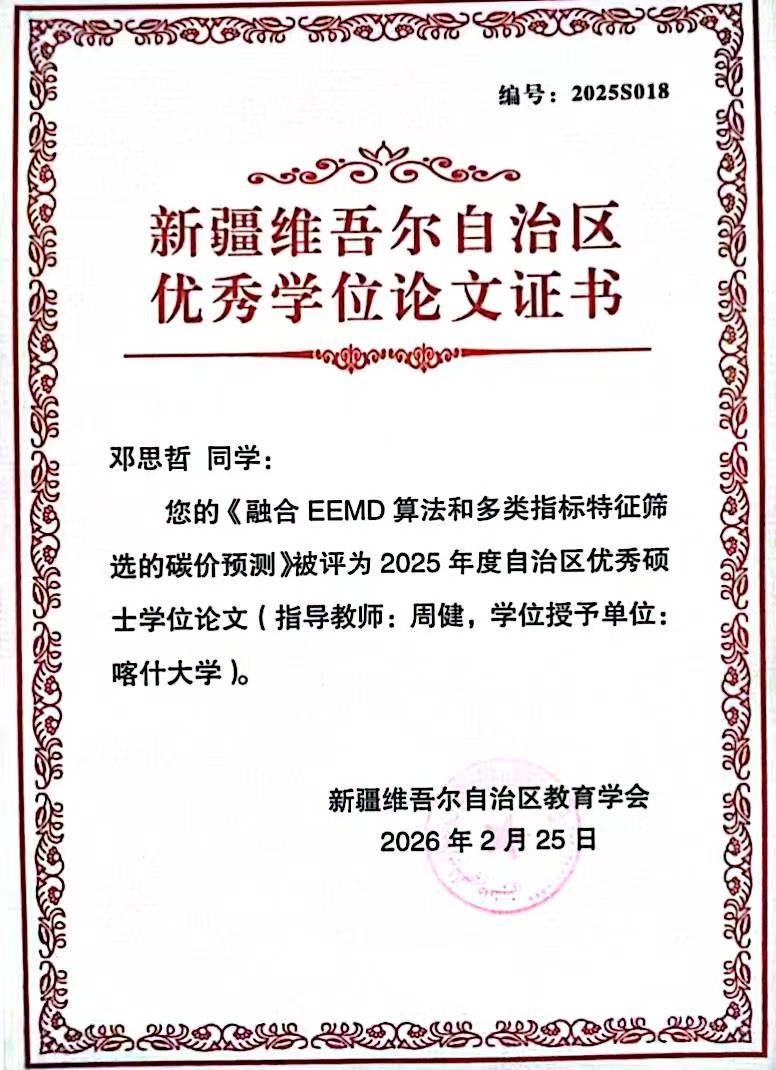 近日,2025年度新疆自治区优秀硕士学位论文评选结果揭晓。学校经济与管理学院与喀什大学经济与管理学院联合培养研究生邓思哲的硕士论文《融合EEMD算法和多类指标特征筛选的碳价预测》获评优秀硕士学位论文,成为喀什大学本年度唯一获此殊荣的硕士论文。