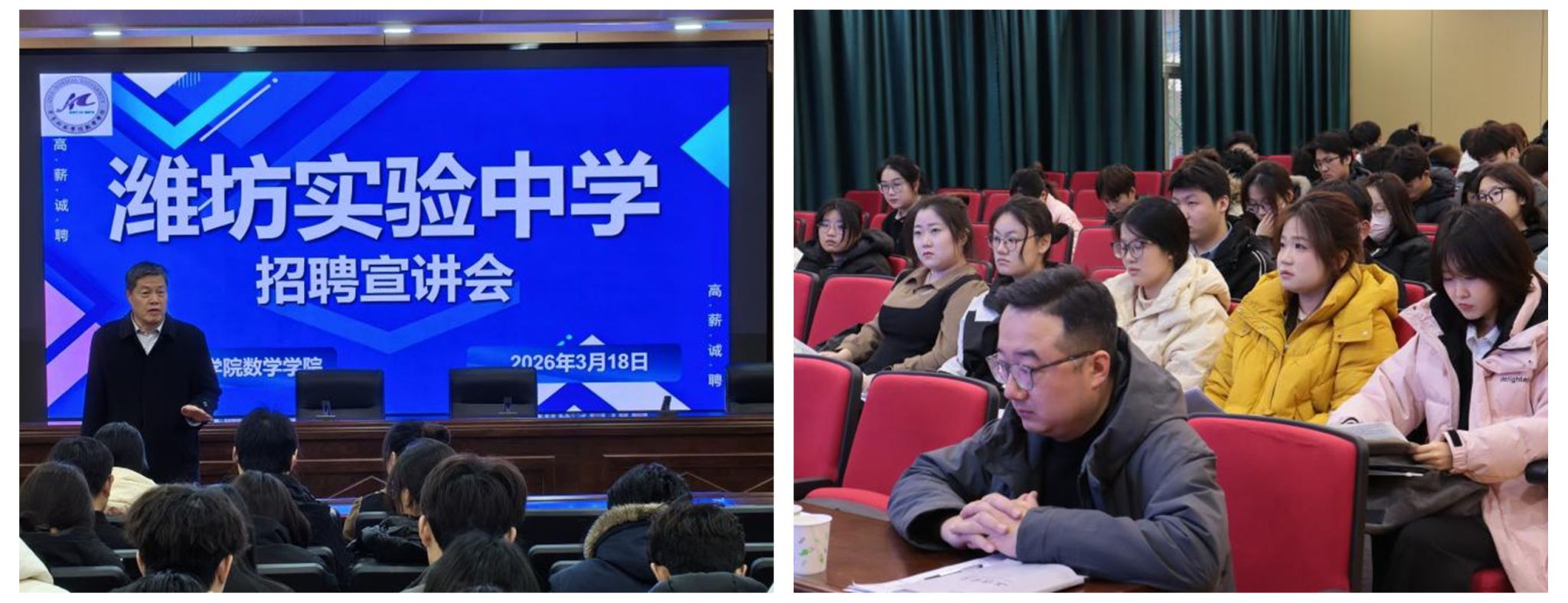 为拓宽师范毕业生就业渠道、提升就业质量,3月18日,数学学院携手潍坊实验中学在章丘校区第二学术报告厅举办教师专场招聘会,面向毕业生开放语文、数学、英语等多学科教师岗位,搭建起用人单位与毕业生的精准高效双选平台。