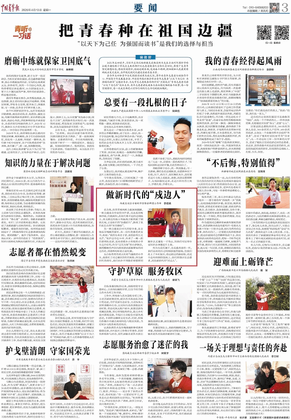 近日,《中国青年报》要闻版以《把青春种在祖国边疆》为题,讲述了多名大学生志愿服务西部计划“卫国戍边”专项志愿者牢记习近平总书记嘱托,“以天下为己任”,扎根西部、奉献边疆的奋斗故事。其中,我校毕业生李绍倩的事迹也闪亮其中,充分彰显了齐鲁师院学子勇于追梦、敢于担当的精神风貌。