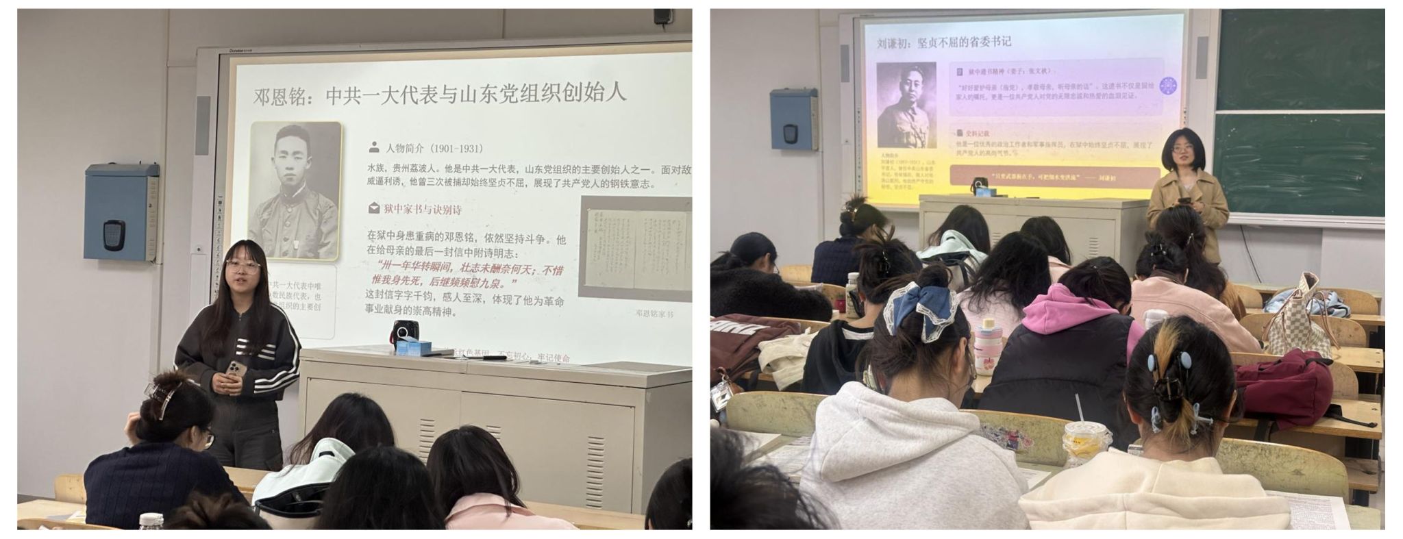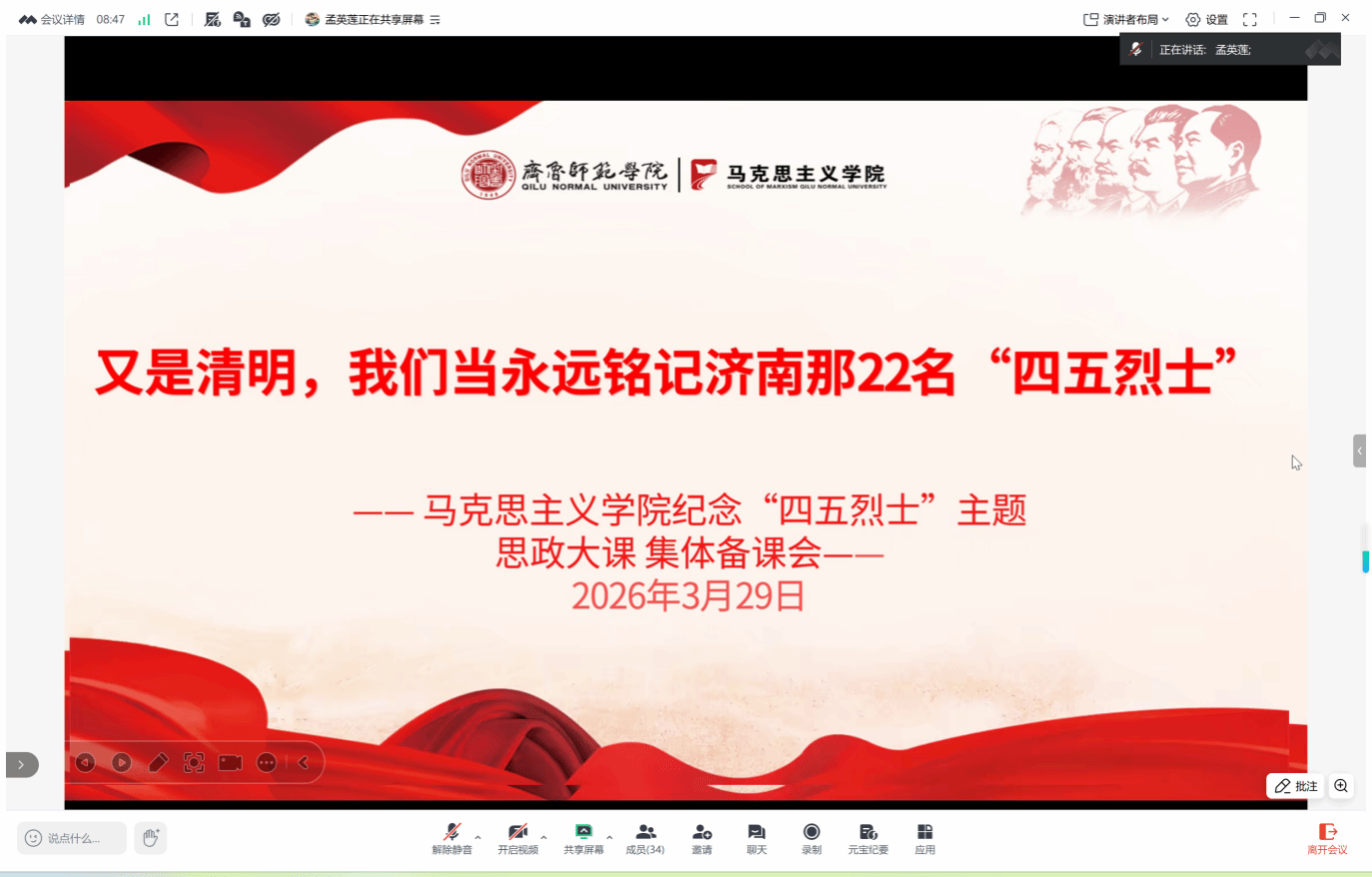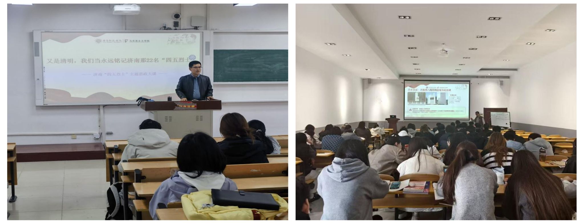 清明节到来前夕,马克思主义学院以纪念济南“四五”烈士英勇就义95周年为契机,聚焦“四五”烈士英勇事迹与精神传承,精心策划万名学子同上一堂思政大课活动。用红色革命精神滋养青年心灵、筑牢信仰根基。活动覆盖全校万余名学生,将理论学习、师资培育、课堂教学深度融合,以沉浸式、全覆盖、立体化的育人模式,把“四五”烈士精神融入“大思政课”全流程,引导青年学子铭记英烈功绩、传承红色血脉、勇担时代使命,让革命精神在新时代青年中焕发新生力量。