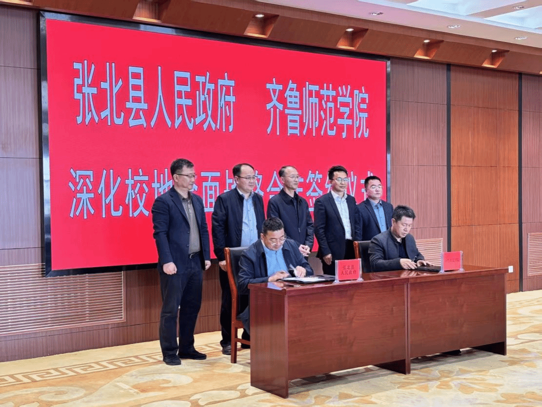王伟与刘勇分别代表双方签署《张北县人民政府、齐鲁师范学院深化校地全面战略合作框架协议》,马建成等领导共同见证签约。