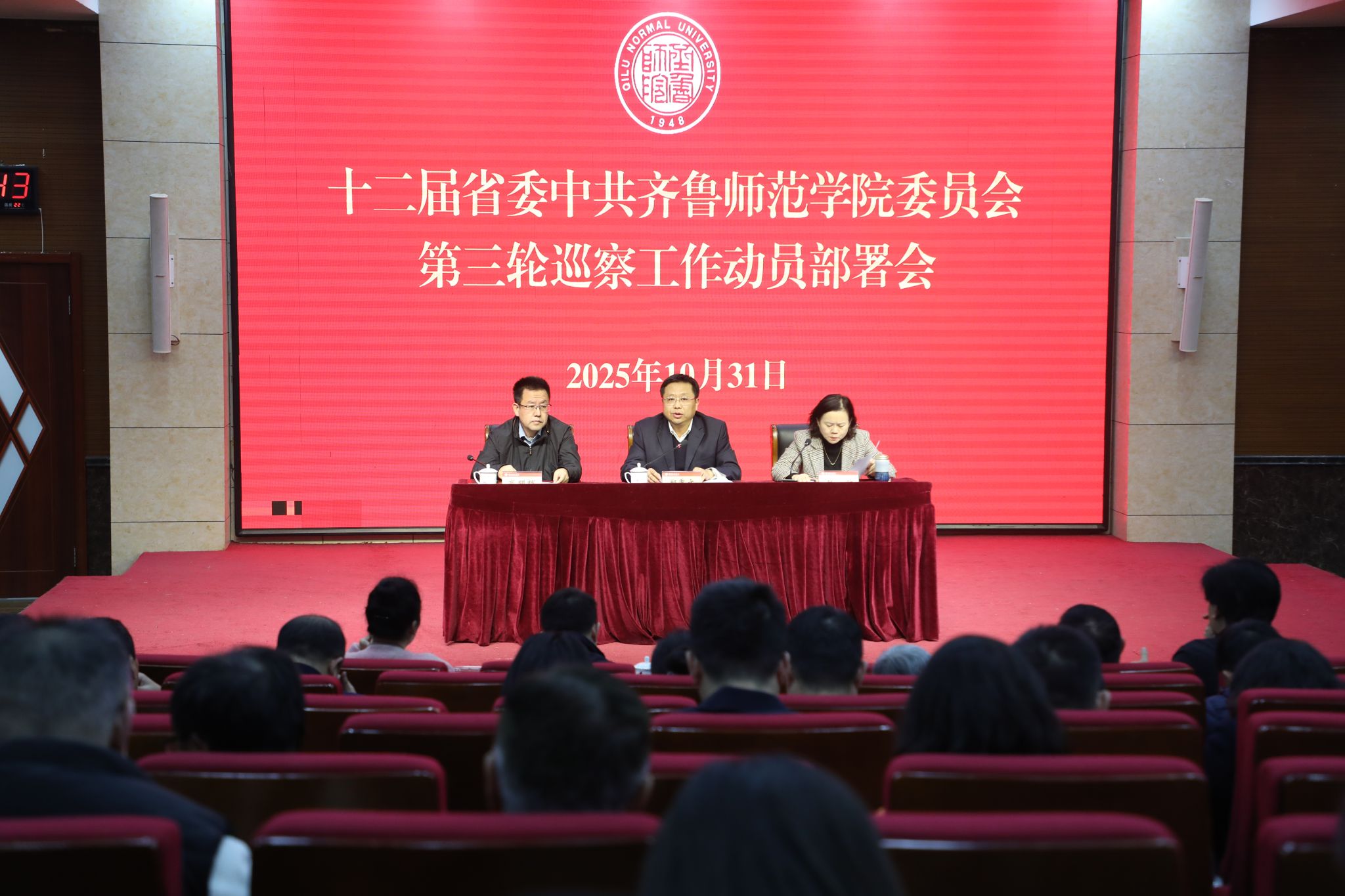 10月31日,齐鲁师范学院在章丘校区第一学术报告厅召开十二届省委学校党委第三轮巡察工作动员部署会议。党委副书记、校长郑秀文出席会议并作动员讲话,党委副书记、巡察工作领导小组副组长赵敏,党委委员、纪委书...查看更多 -