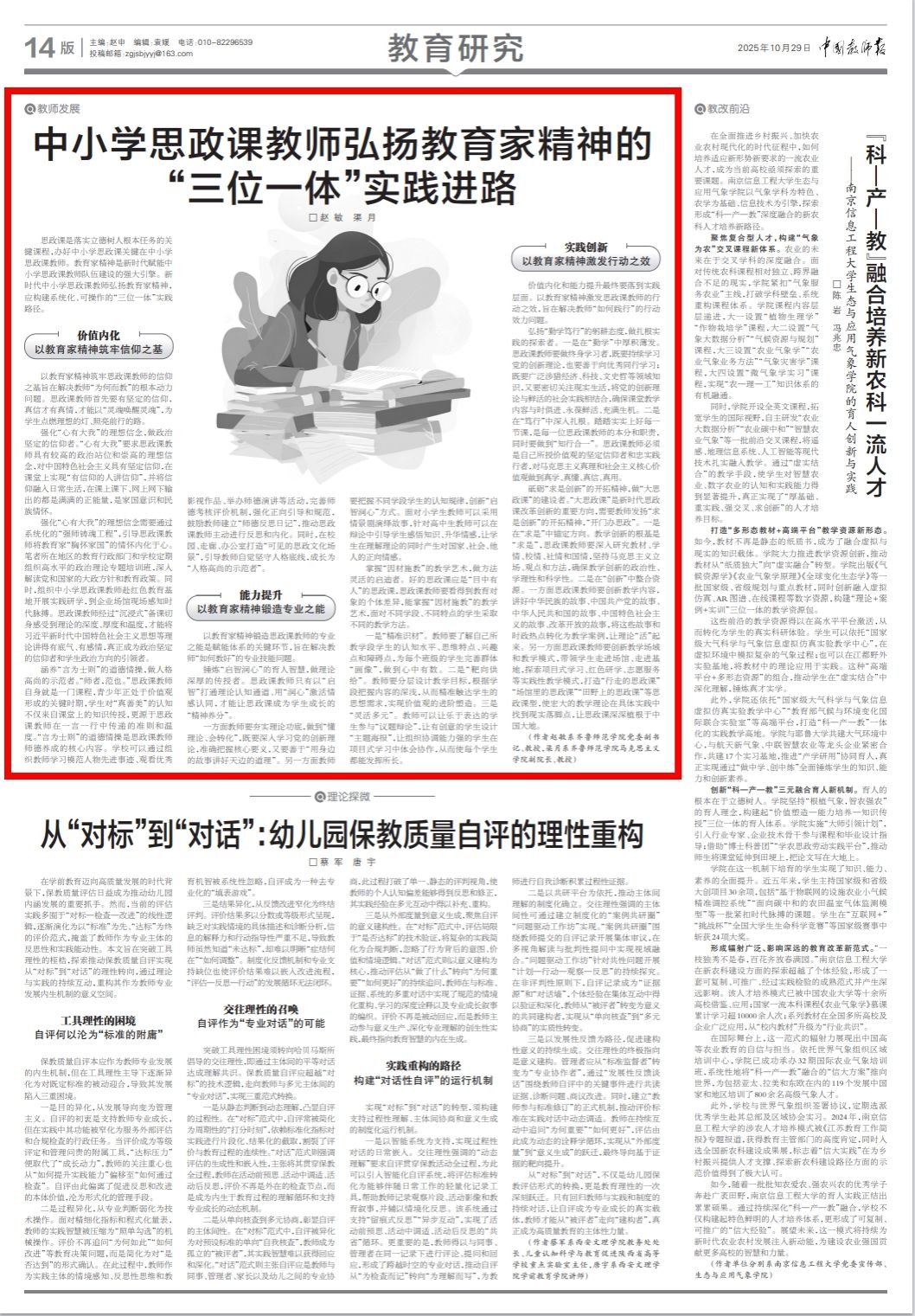 近日,学校党委副书记赵敏教授在《中国教师报》发表了题为《中小学思政课教师弘扬教育家精神的“三位一体”实践进路》的理论文章。