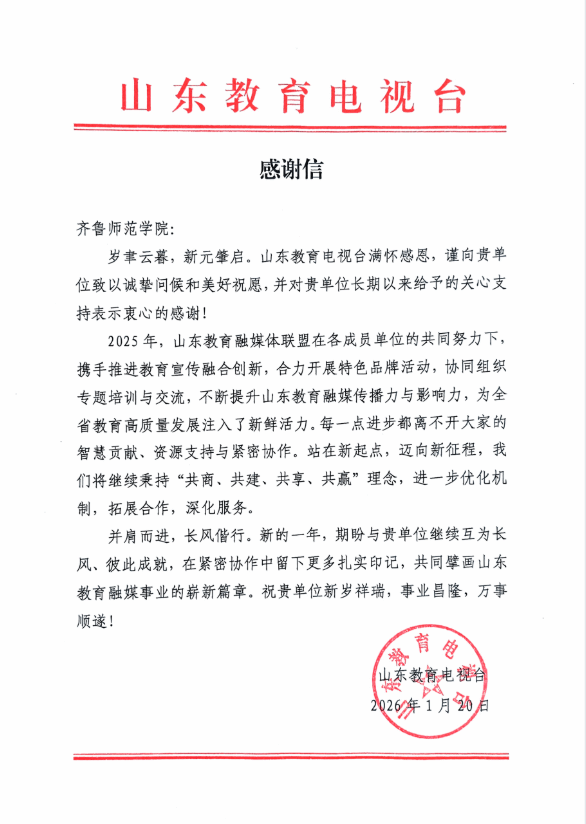 山东教育电视台在感谢信中表示,2025年,与我校携手推进教育宣传融合创新,不断提升山东教育融媒传播力与影响力,为全省教育高质量发展注入了新鲜活力。期待与我校继续互为长风、彼此成就,共同擘画山东教育融媒事业的崭新篇章。
