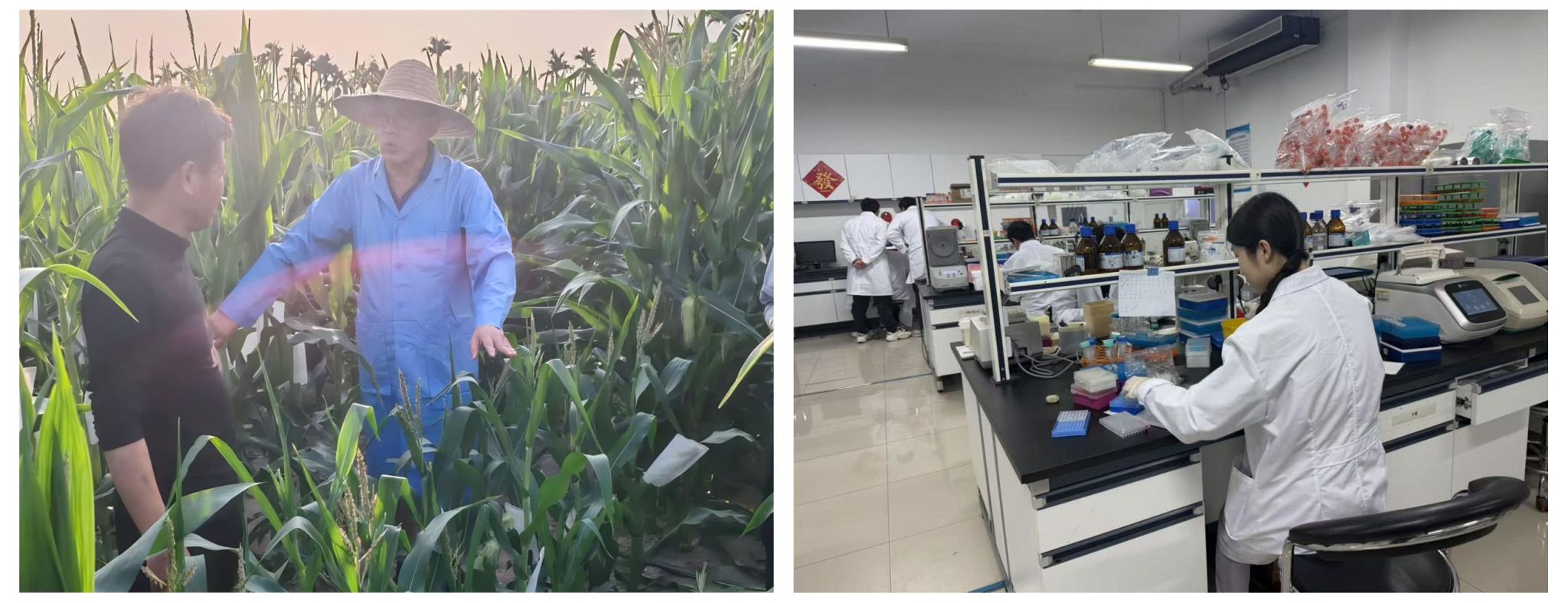 现代农业技术研究院路小铎教授团队积极响应“种源自主可控、种业科技自立自强”的号召,坚持扎根田间地头做学问,与实验室协同推进研究。田间,路小铎教授带领团队成员郭效龙、联培硕士研究生郭亚轩在海南三亚百亩“南繁基地”开展玉米授粉、种植筛选创新工作;学校实验室,同步围绕山东省重点研发计划农业良种工程项目、山东农业发展集团主粮品种突破“揭榜挂帅”项目,开展蛋白检测、基因型鉴定等实验,推进玉米种质资源创新、品种改良及 EMS 诱变突变体库完善工作,同时提供突变体库材料分发服务,助力科技成果转化,为保障国家粮食安全作出积极贡献。