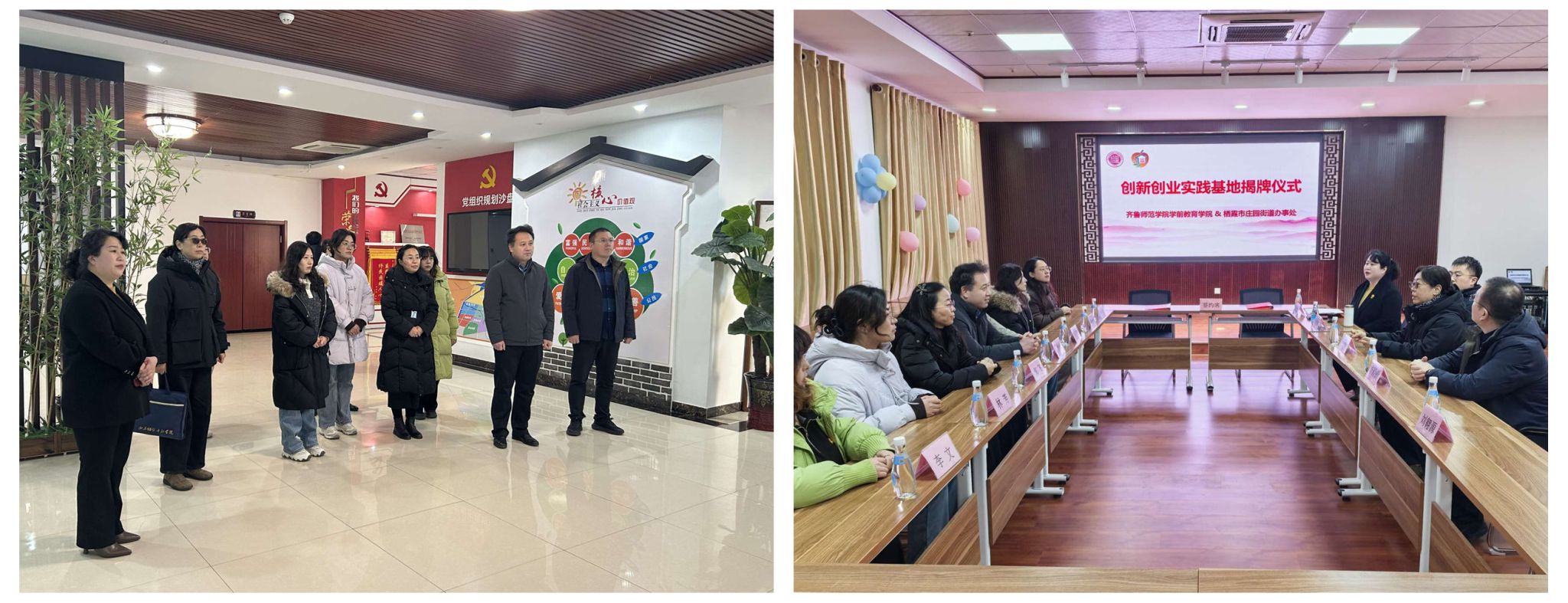 为深化校地协同育人,拓展实践教学平台,加强辅导员队伍建设,1月29日,学前教育学院党委书记郑海斌、党委副书记孙建凯带领学院辅导员团队赴栖霞市庄园街道开展创新创业实践基地共建与辅导员素质拓展活动。