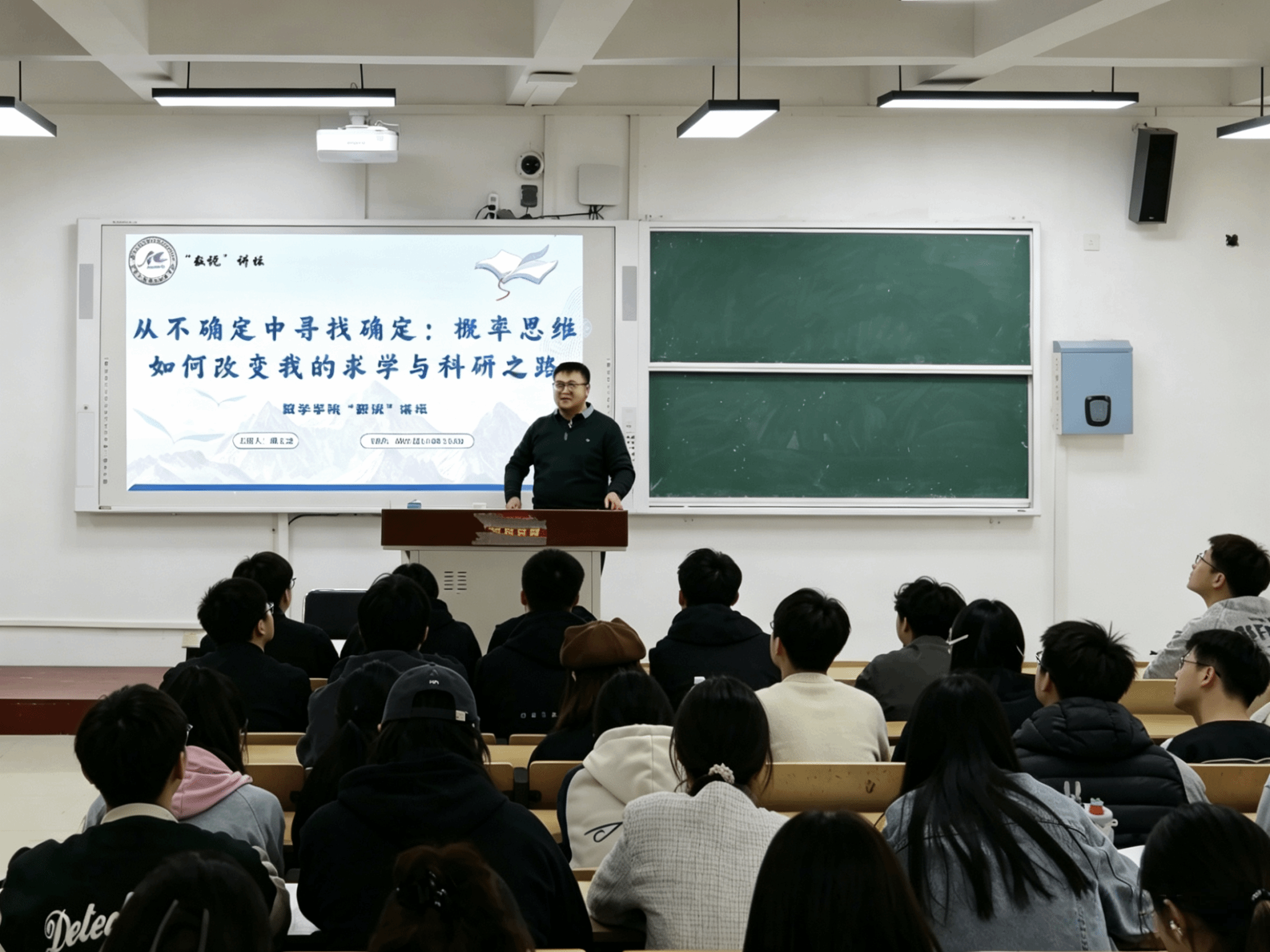 为进一步丰富课程育人载体,助力学子筑牢专业思维、拓宽学术视野,4月9日下午,数学学院特色品牌活动“数说”讲坛第二期如期开讲。本期讲坛以“从不确定中寻找确定:概率思维如何改变我的求学与科研之路”为主题,特邀曲天尧博士担任主讲人,百名学子到场聆听,在教师的成长分享中汲取前行力量、明晰发展方向。