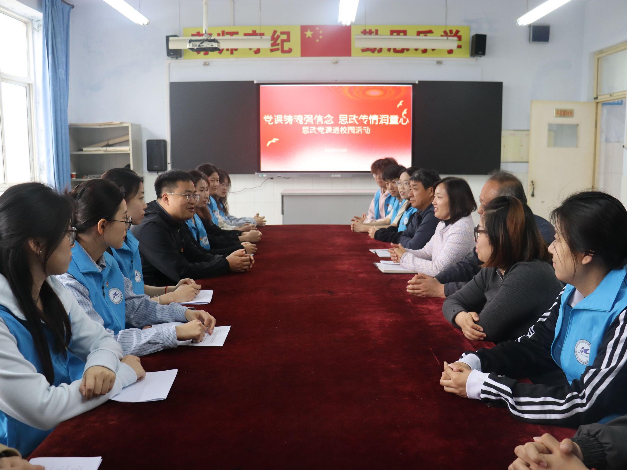 活动伊始,校方对学院师生的到来表示热烈欢迎,并详细介绍了学校办学概况与思政教育开展情况。学院代表围绕党建引领思政育人、师范生人才培养特色,以及高校优质教育资源下沉基层、服务基础教育的重要意义展开交流。双方一致认为,地方深厚的文化底蕴与高校丰富的育人资源形成优势互补,为校地共建、协同育人创造了广阔空间,未来将在实践研学、志愿服务等领域深化合作,推动共建项目常态 化、长效化开展。