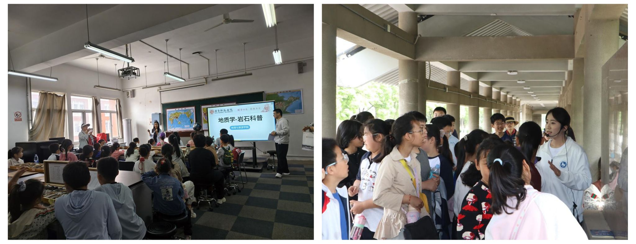 活动共分五站,研学团师生首先来到地理与旅游学院展厅。活动负责人向师生们介绍了学院的发展历程、学科特色及育人成果,帮助小同学们快速了解专业背景,激发探索兴趣。在位于一号教学楼A409的岩石标本实验室里,马鑫老师团队借助丰富的岩石标本,系统讲解了岩石的形成、分类及地质特征,直观地为同学们揭开了地球科学的神秘面纱。